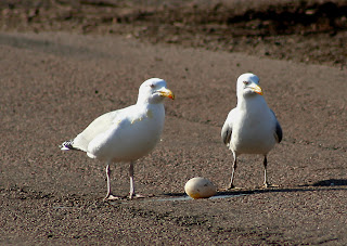 Här njuter två stycken halländska surtrutar sin påskaftonssupé. Riktiga fågelkännare kallar antagligen fågeln för gråtrut. Med den här uppsynen passar artnamnet surtrut bättre.